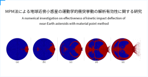まず、Simdroid-MPMに関連する論文「MPM法による地球近傍小惑星の運動学的衝突挙動の解析有効性に関する研究」では、NASAのDART計画に関連し、小惑星の軌道偏向を目的とした運動学的衝突解析をMPMにより実施。弾塑性挙動・粒状流動・破砕過程を再現し、FEMでは再現が難しい大変形や多相流挙動を正確に表現しました。結果は超高速衝突実験と整合し、惑星防衛分野へのMPMの有効性を実証しました。