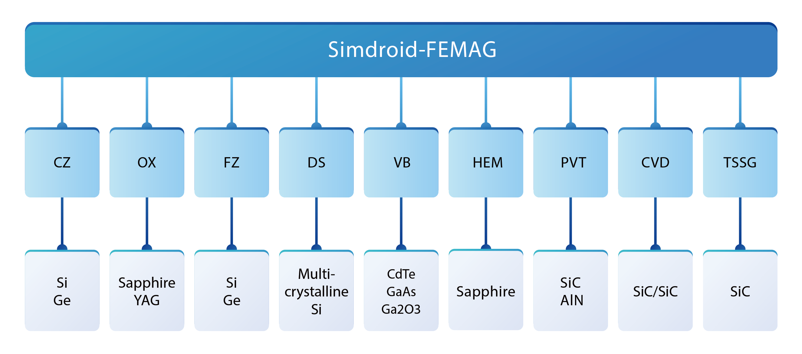 結晶成長CAEソフト、結晶育成プロセスデジタルツイン、CZ引き上げをはじめ、融液、気相及び溶液の結成育成方法に個別で対応するシミュレーションモジュール