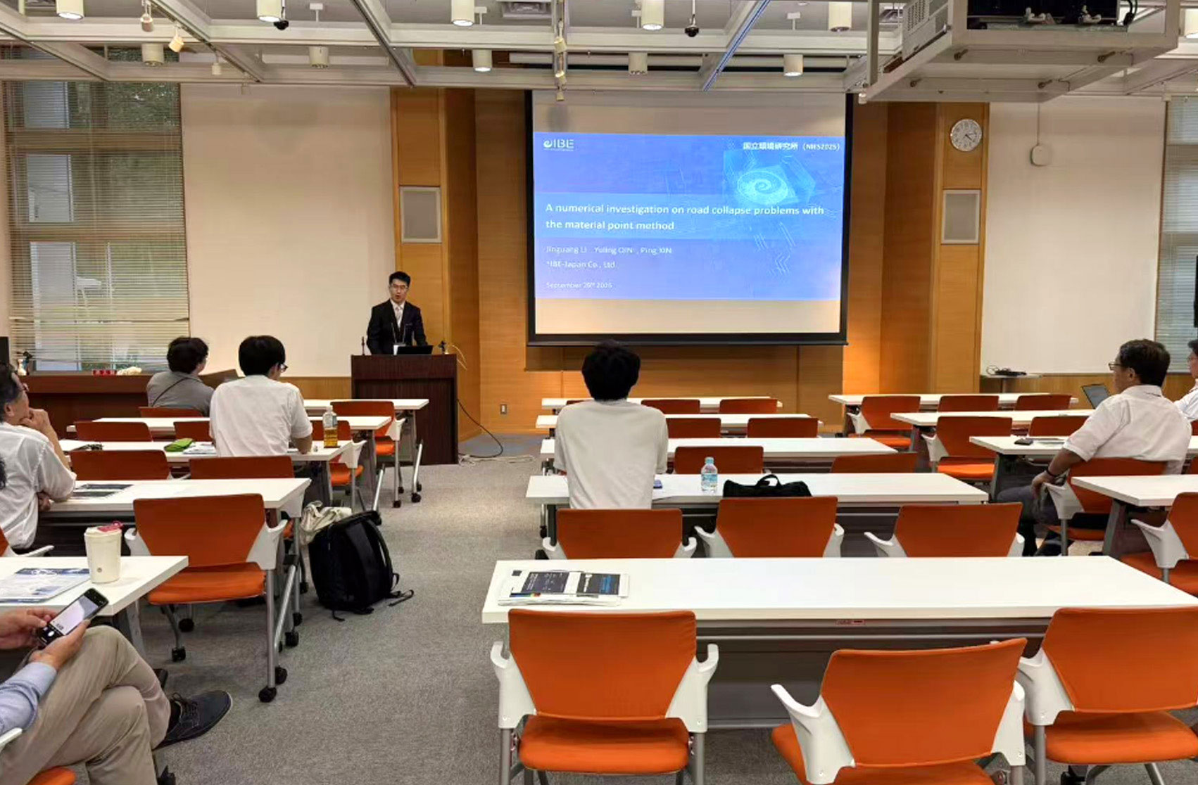当日は、国立環境研究所資源循環領域・廃棄物処理処分技術研究室の石森洋行先生およびIBEジャパンの李金光博士が登壇し、物質点法(MPM)による解析技術を紹介しました。講演では、廃棄物処理・処分の高度化や、道路陥没・盛土崩壊といった地盤問題に対し、MPMが従来のFEM(有限要素法)では再現が困難であった現象の解明に有効であることが示されました。